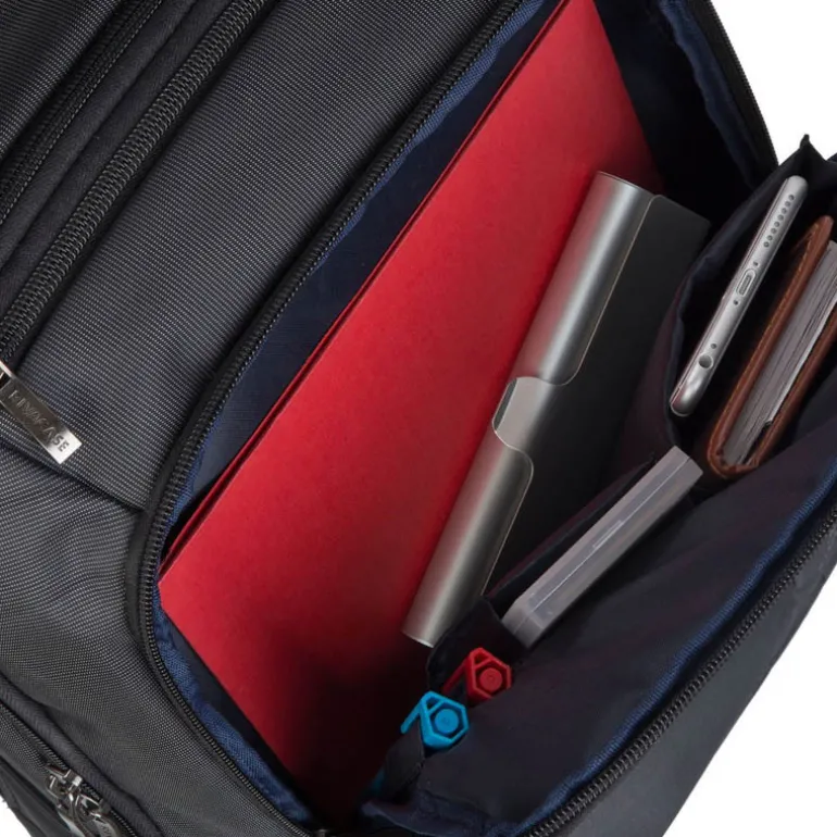 La bolsa ofrece una capacidad de almacenamiento máxima. Además de la sección para el portátil, tiene un compartimento interno para una tableta de hasta 10.1 pulgadas, así como ranuras para libros y documentos. Un bolsillo con cremallera en la parte frontal de la bolsa contiene otros accesorios y cuenta con un panel organizador para un teléfono móvil y tarjetas de presentación. Un espacio en la parte superior de la bolsa también alberga pequeños dispositivos electrónicos, y dos bolsillos laterales sostienen botellas de agua.