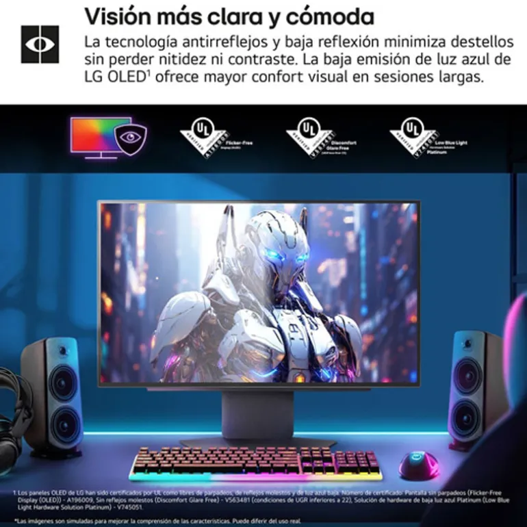 Disfruta de sesiones de juego más cómodas con la tecnología de reducción de luz azul de LG OLED, certificada por UL con la clasificación de baja emisión de luz azul platino, te garantiza una experiencia de juego cómoda y envolvente, manteniendo colores vibrantes y realistas.