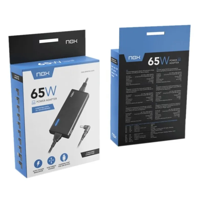 En Nox no queremos que te quedes sin energía en ningún sitio, por ello, hemos diseñado este cargador universal de corriente para portátil con regulación automática de voltaje. Dispone de 10 conectores distintos: 15V (Toshiba), 16V (IBM), 16V (Sony, Fujitsu), 18,5V (Compaq), 18,5V (HP, Compaq) 19V (Acer, Asus, Compaq, Dell, Fujitsu, Gateway, Toshiba, Lenovo, Liteon), 19V (Samsung), 19V (Acer, Compaq, HP, Fujitsu, Gateway, Toshiba, Liteon), 19,5V (Sony), 20V (Lenovo), los cuales abarcan la mayoría de las principales marcas de portátiles del mercado.