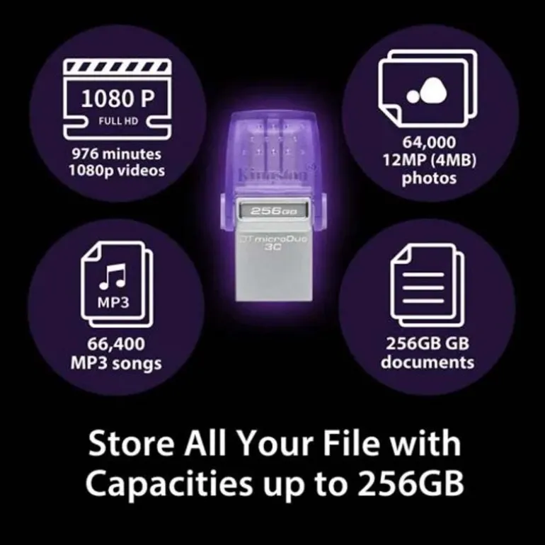 DataTraveler® microDuo鈩 tiene una doble interfaz que funciona con los nuevos USB Type-C® y los puertos USB Type-A tradicionales. Es una forma ideal de liberar espacio en tu smartphone o tableta con hasta 256 GB de almacenamiento adicional para fotos y vídeos. El atractivo formato ofrece una cómoda conectividad plug and play. Transfiere rápidamente archivos entre tus dispositivos a una velocidad de hasta 200 MB/s de lectura por el USB 3.2 Gen 1
