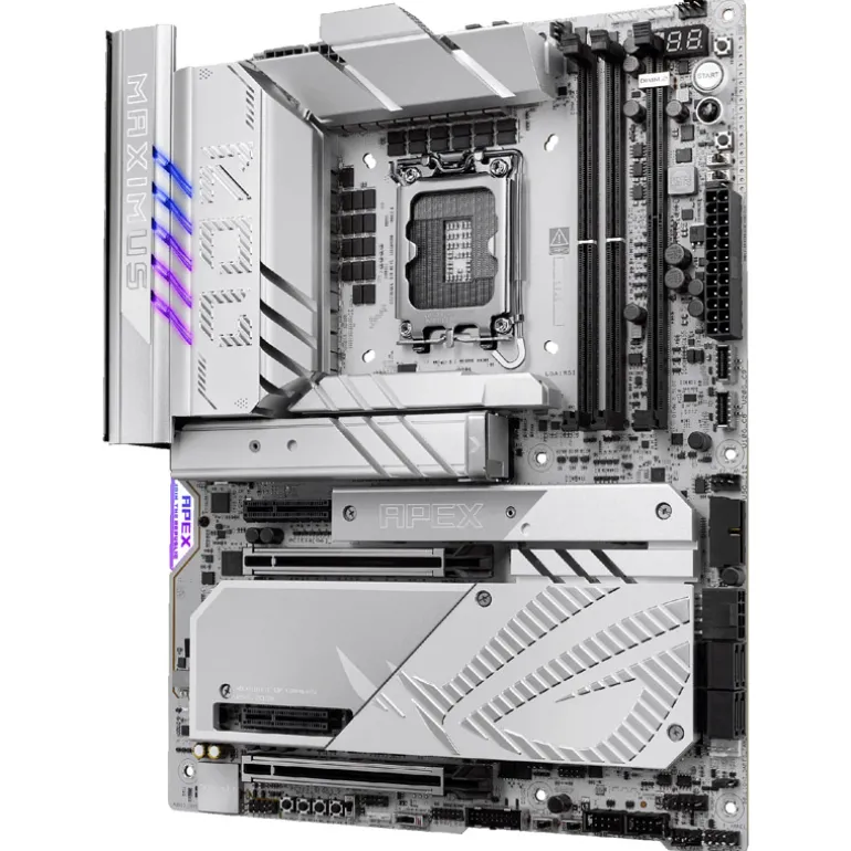 Finalmente, la Z890 Apex presenta un diseño estético y funcional, con un sistema de refrigeración eficiente que incluye disipadores de calor para los componentes críticos. Los usuarios pueden personalizar la iluminación y la configuración de su placa base mediante el software Armoury Crate, lo que les permite crear un setup único que refleje su estilo personal.