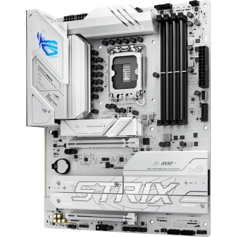 La ROG Strix B860-A presenta un diseño blanco limpio que complementa cualquier construcción. Sus disipadores de calor metálicos a juego realzan el aspecto elegante, mientras que la iluminación Aura Sync RGB agrega efectos personalizables para un estilo sutil o audaz.