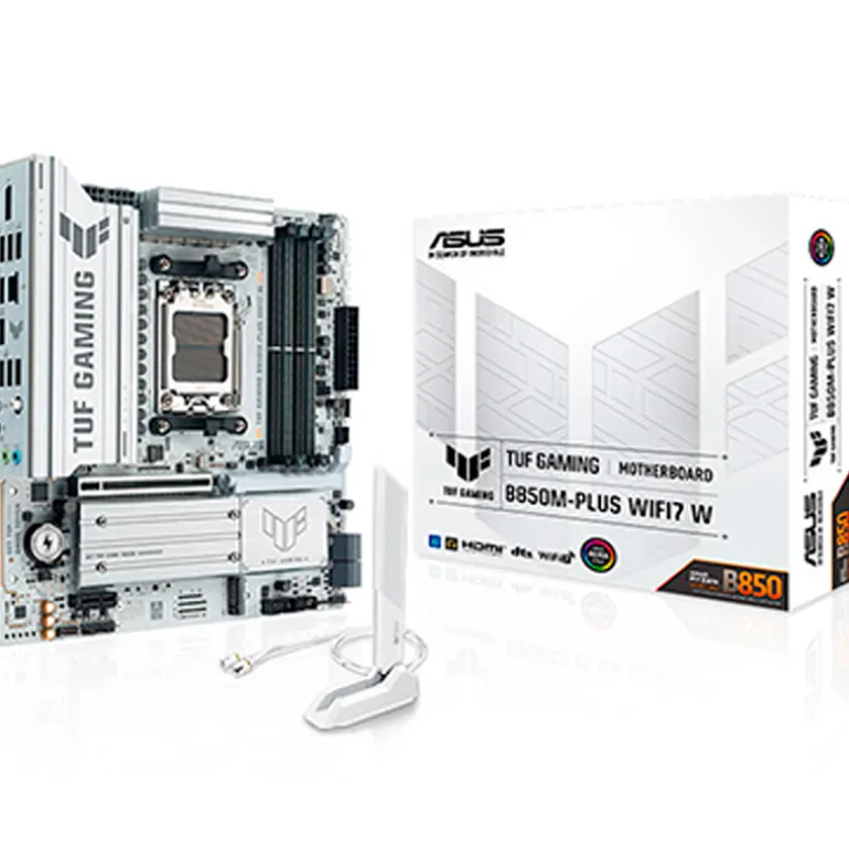 ASUS TUF GAMING B850M-PLUS WIFI7 W toma todos los elementos esenciales de los últimos procesadores AMD Ryzen鈩ñada con componentes de grado militar, una solución de alimentación mejorada y un completo sistema de refrigeración, esta placa base supera las expectativas con un rendimiento sólido como una roca y estable para juegos maratonianos. Las placas base TUF GAMING también se someten a rigurosas pruebas de resistencia para garantizar que pueden soportar condiciones en las que otras podrían fallar. Esta plataforma ofrece la potencia y la conectividad que exigen las aplicaciones informáticas avanzadas de IA.