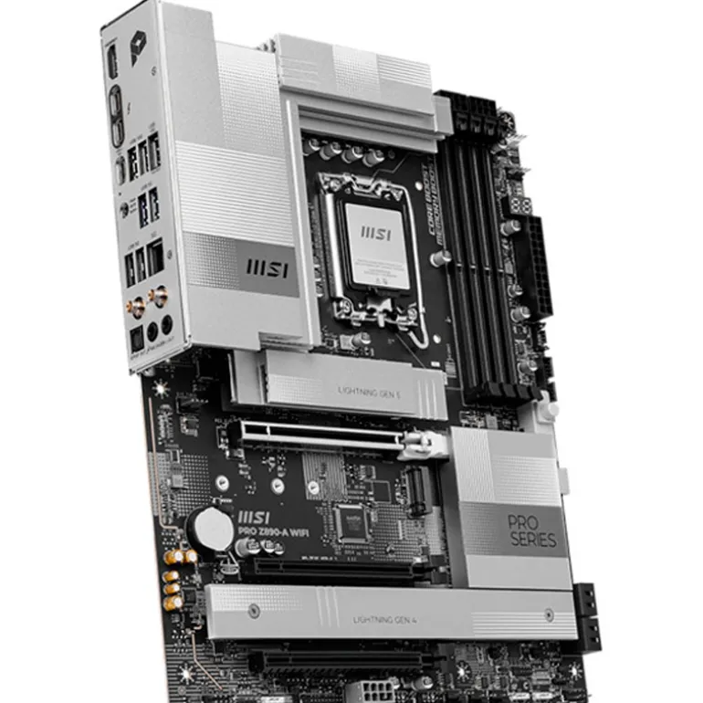 La PRO Z890-A WIFI presenta un diseño sencillo con una armoniosa combinación de color plateado que encaja perfectamente tanto en configuraciones de PC blancas como negras. Está diseñada con múltiples características exclusivas de MSI, incluyendo Wi-Fi 7 real con EZ Antenna, LAN 5G, Thunderbolt 4, PCIe 5.0 M.2 con EZ M.2 Shield Frozr II y alimentación PCIe suplementaria, preparada para los procesadores Intel® Core鈩