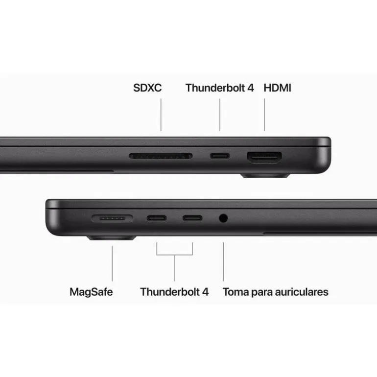 - Modelos M3 Pro y M3 Max: Tres puertos Thunderbolt 4 compatibles con carga, DisplayPort, Thunderbolt 4 (hasta 40 Gb/s), USB 4 (hasta 40 Gb/s).