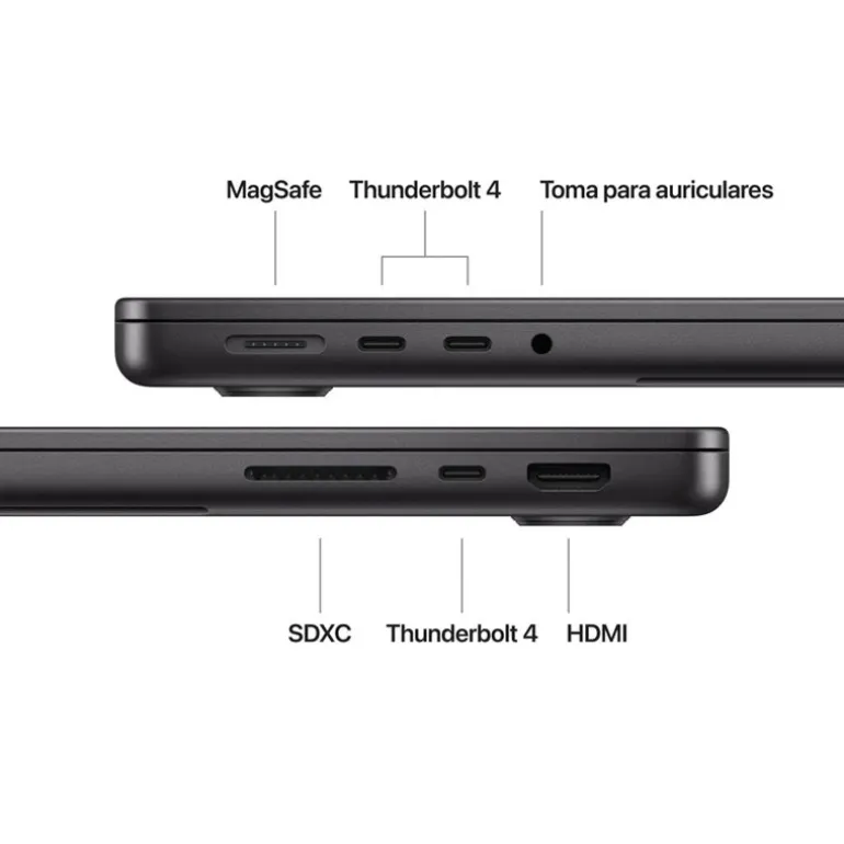 El MacBook Pro de 14 pulgadas incorpora tres puertos Thunderbolt 4, un puerto de carga MagSafe 3, ranura para tarjetas SDXC, puerto HDMI y toma para auriculares. Y puedes añadir hasta dos monitores externos.