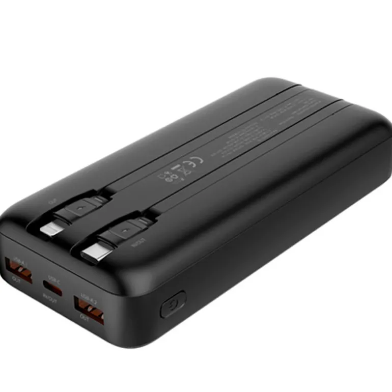 Powerbank DP20 20000mAh, pantalla LCD y cables integrados USB-C y Lightning, Carga rápida. Recarga varias veces tu smartphone, tablet o dispositivos compatibles. Gracias a sus 20000mah tendrás batería para rato.