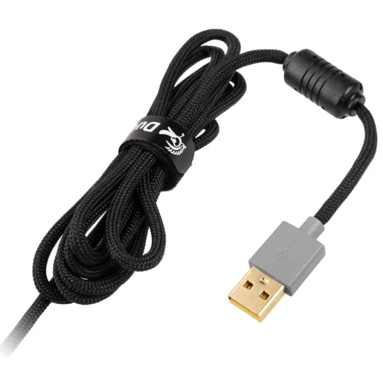 - El Ducky Feather pesa solo 65 gramos y, por lo tanto, es particularmente suave y adecuado para largas sesiones de juego. El cable Ducky Feather tiene un ángulo de 7,91° hacia arriba en el mouse. Esto crea espacio libre entre el cable y la superficie, lo que reduce la tracción del cable y facilita aún más los movimientos del mouse.
