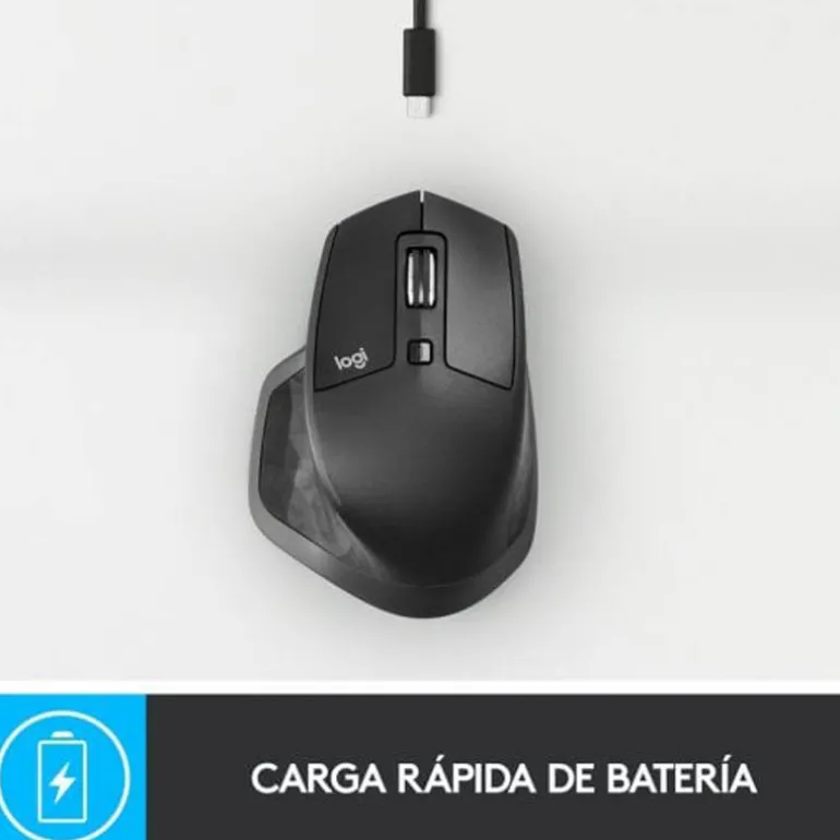 - Basta con conectar MX Master 2S al ordenador con el cable de carga micro USB para recibir energía suficiente para un día completo de uso en sólo tres minutos. Una carga completa puede durar hasta 70 días.
