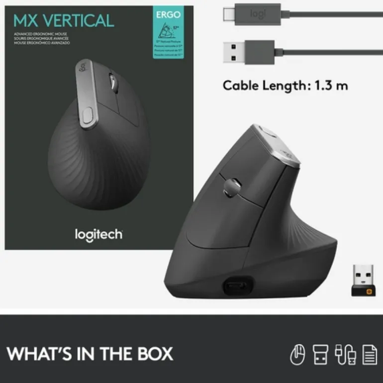 El exclusivo ángulo vertical de 57° de MX Vertical reduce la presión en la muñeca y el pulgar se asienta cómodamente en su soporte.