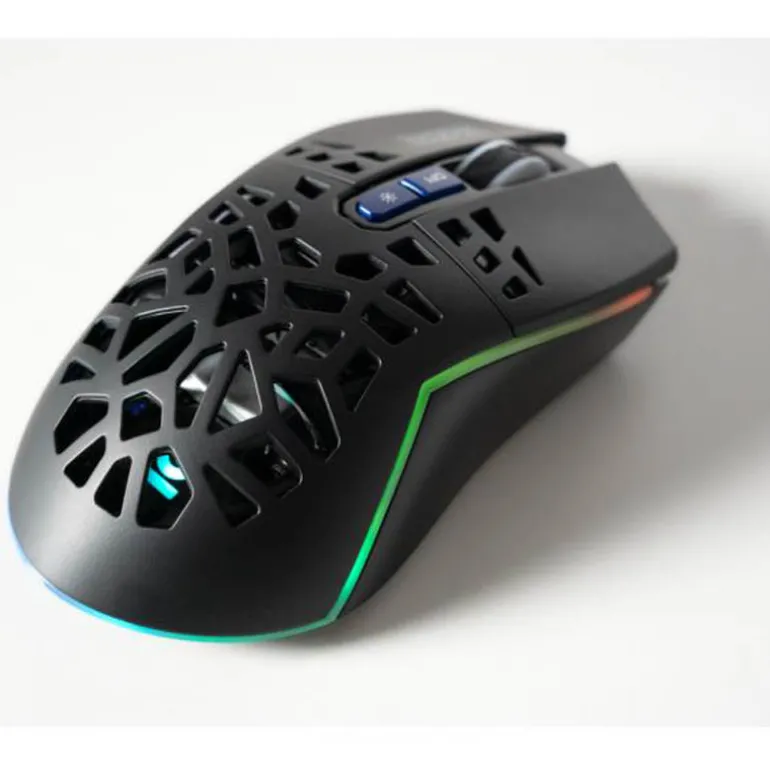 La rueda de desplazamiento de goma se desliza suavemente, y los botones izquierdo y derecho ofrecen clics silenciosos, lo que te permite concentrarte por completo en tu juego sin molestar a quienes te rodean. Bajo la rueda de desplazamiento, encontrarás dos botones adicionales: uno para ajustar los PPP (puntos por pulgada) y otro para cambiar los modos de iluminación. Además, los dos botones laterales del ratón te brindan funciones de «avance» y «retroceso» con un simple clic.