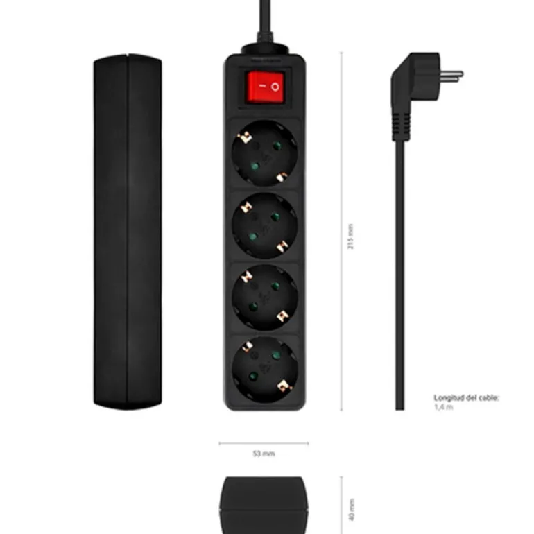 Con un acabado en color negro y un diseño sobrio, esta regleta se integra sin problemas en cualquier entorno, ya sea doméstico o profesional, ofreciendo una solución sencilla, eficiente y duradera para la gestión de enchufes.