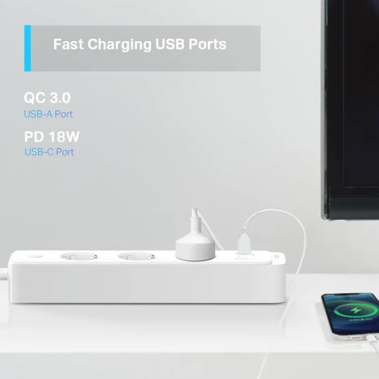 Regleta Todo en Uno: Con puertos USB de carga rápida y control individual de cada enchufe, esta regleta ofrece una solución completa para tus necesidades de alimentación y control.