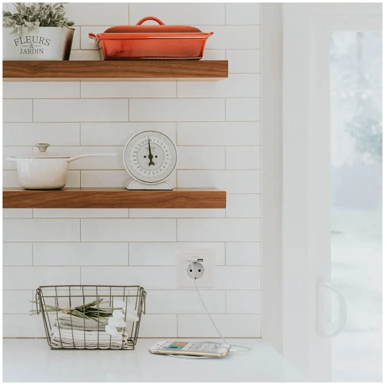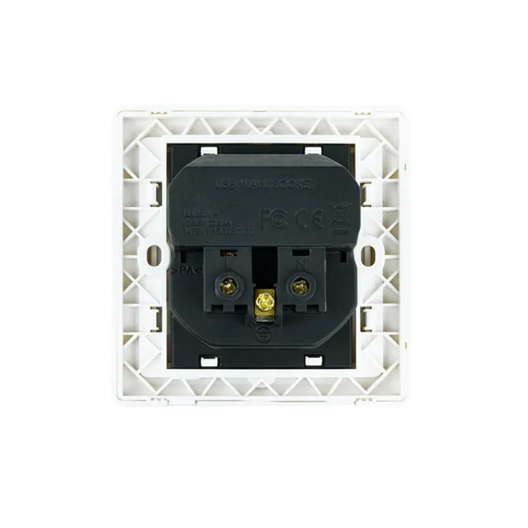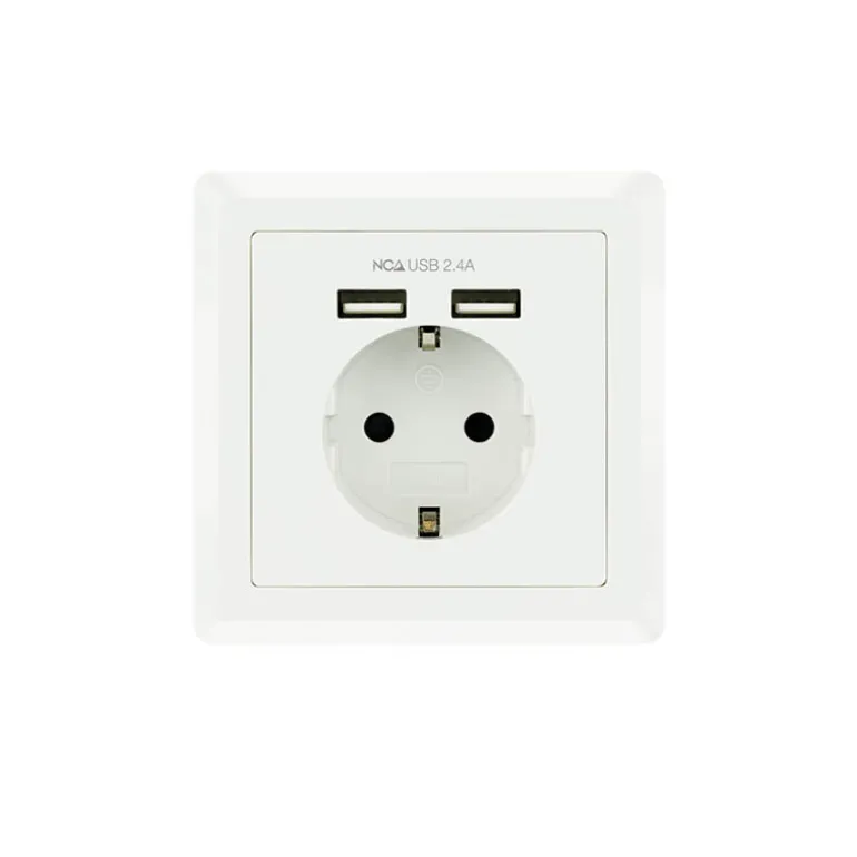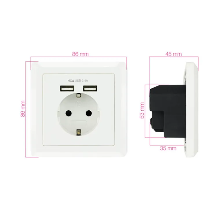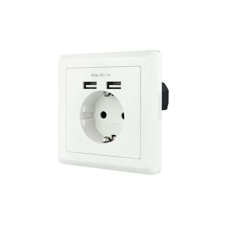 Base de enchufe de pared tipo schuko con 2 tomas USB. Producto apto para instalar en cajetín universal mediante tornillos.