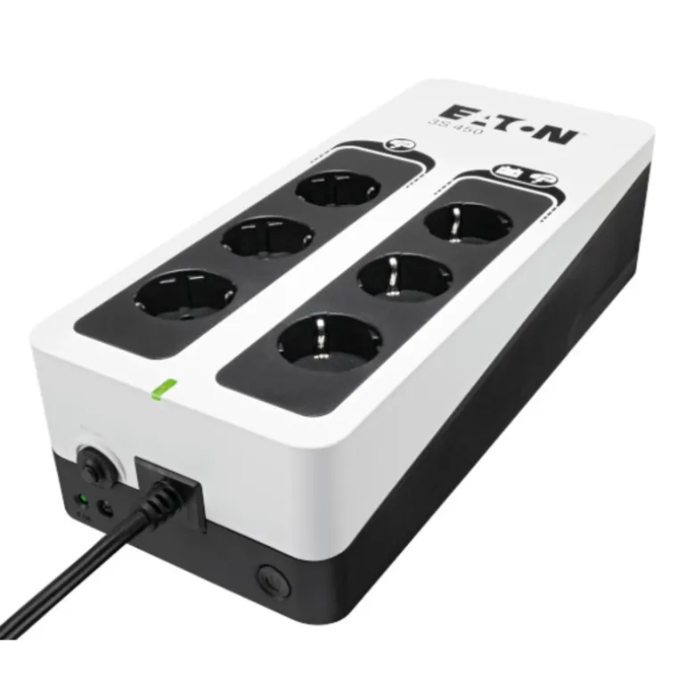 Eaton 3S450D. Topología UPS: En espera (Fuera de línea) o Standby (Offline), Capacidad de potencia de salida (VA): 450 VA, Potencia de salida: 270 W. Cantidad de salidas AC: 6 salidas AC. Tecnología de batería: Sealed Lead Acid (VRLA). Color del producto: Negro, Blanco, Longitud de cable: 1,5 m, Seguridad: IEC 62040-1; IEC 62040-2 C2; IEC 62040-3; IEC 62040-4; IEC 61643-11. Ancho: 325 mm, Profundidad: 140 mm, Altura: 86 mm
