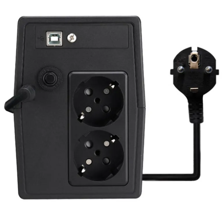 En términos de conectividad, el SAI ofrece múltiples opciones, incluyendo un puerto USB para la gestión del dispositivo y un conector Schuko en la entrada. Aunque no incluye puerto LPT ni tarjeta de red, su diseño simplificado se centra en la protección esencial del hardware. Además, cuenta con certificación CE, lo que garantiza su conformidad con los estándares de seguridad y calidad europeos.