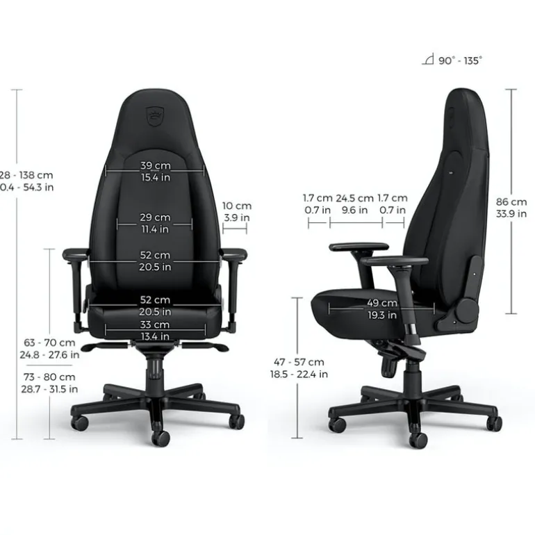 La estructura de la serie ICON de noblechairs está formada por una base de cinco puntos con recubrimiento de polvo, recientemente mejorada, compuesta por aluminio macizo y ruedas especiales. Estas ruedas de 60 mm tienen un núcleo de nylon y un revestimiento de poliuretano. Gracias a estos materiales, son suaves, silenciosas durante el movimiento y se adaptan por igual a suelos blandos y duros. El elevador hidráulico de gas cuenta con la certificación de seguridad de clase 4 y, en combinación con la nueva base optimizada, es adecuado para una carga máxima de hasta 150 kg.