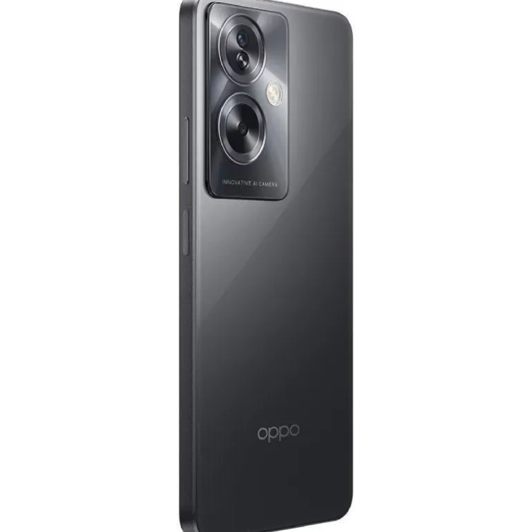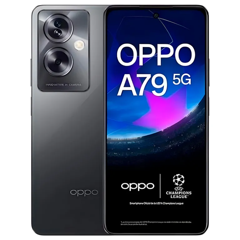 Smartphone Oppo A79, con pantalla FHD+ de 6.7″, 4GB de RAM, 128GB de almacenamiento y conectividad 5G. Ofrece un diseño elegante Glowing Feather, carga rápida SUPERVOOCTM de 33 W, y visualización optimizada con tecnología solar.