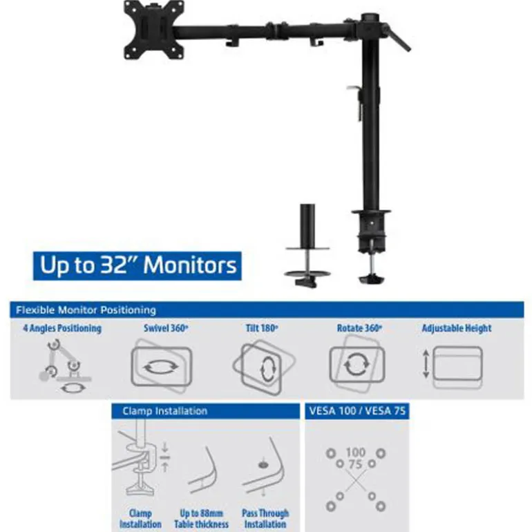 Cree un entorno de trabajo ergonómico y con ahorro de espacio mediante el soporte de escritorio LCD Ewent EW1510. Coloque el monitor a la altura y con el ángulo de visualización ideales para conseguir una postura mejor y, de esta manera, evitar dolencias de espalda, cuello y hombros. El soporte de escritorio Ewent EW1510 es adecuado para pantallas de hasta 32 pulgadas y es fácil de acoplar al escritorio a través de un abrazadera o soporte con ranura.