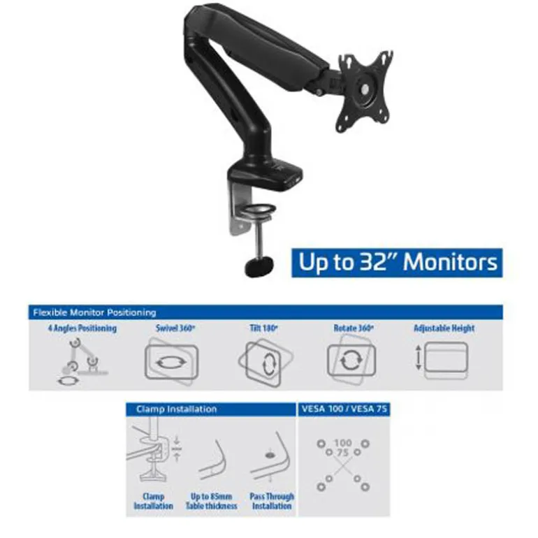 Ajuste el monitor a su gusto configurando la distancia de visualización ideal. El soporte para escritorio es adecuado para un monitor de hasta 32 pulgadas con un peso comprendido entre los 2 y los 6,5 Kg. Su EW1515 cuenta con un soporte VESA de 75×75 mm y 100×100 mm. El sistema de instalación sencillo posibilita el acoplamiento de un monitor al soporte de escritorio sin que necesite ayuda de nadie. Incluye todos los engranajes para el montaje, tanto para la abrazadera como para el soporte con ranura.