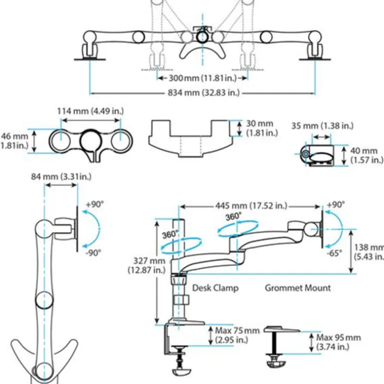 El brazo para monitor, de montaje en sobremesa, ofrece un gran rango de movimientos por todos los ejes. Para ver páginas o bloques de código más largos sin tener que desplazar hacia abajo, el brazo LCD también soporta rotación de modos de visualización de retrato y paisaje para ambas pantallas.