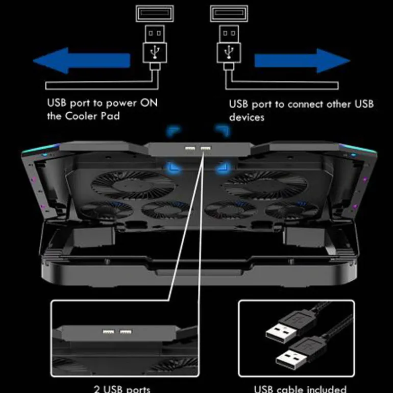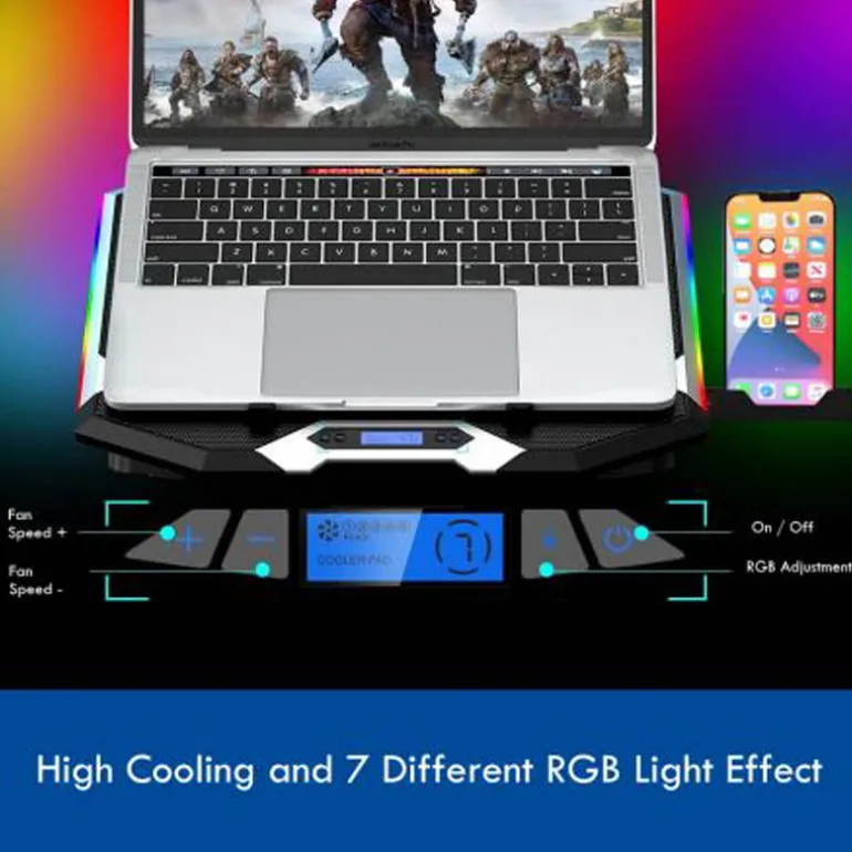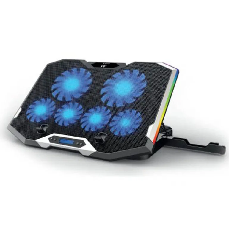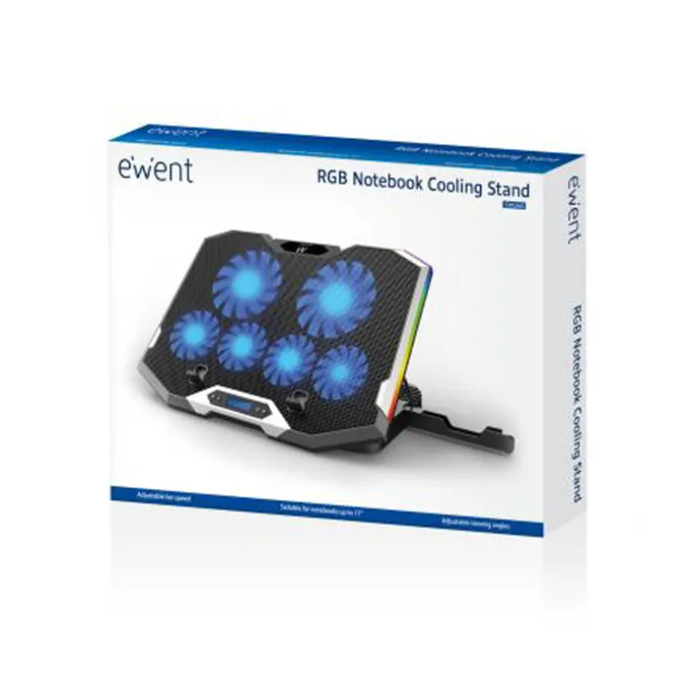 El Ewent EW1260 RGB Multi-angled Notebook Cooling Stand presenta una superficie de malla metálica con seis potentes ventiladores silenciosos para evitar el sobrecalentamiento de los dispositivos. Este soporte versátil se puede usar como soporte para portátil o como base de enfriamiento.