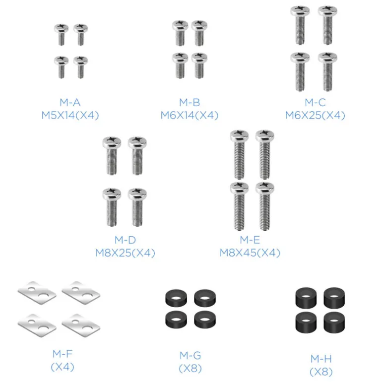 - Compatible con VESA: 75×75, 100×100, 100×150, 100×200, 150×100, 150×150, 200×100, 200×200, 300×200, 300×300, 400×200, 400×300, 400×400, 600×400 y 800×400