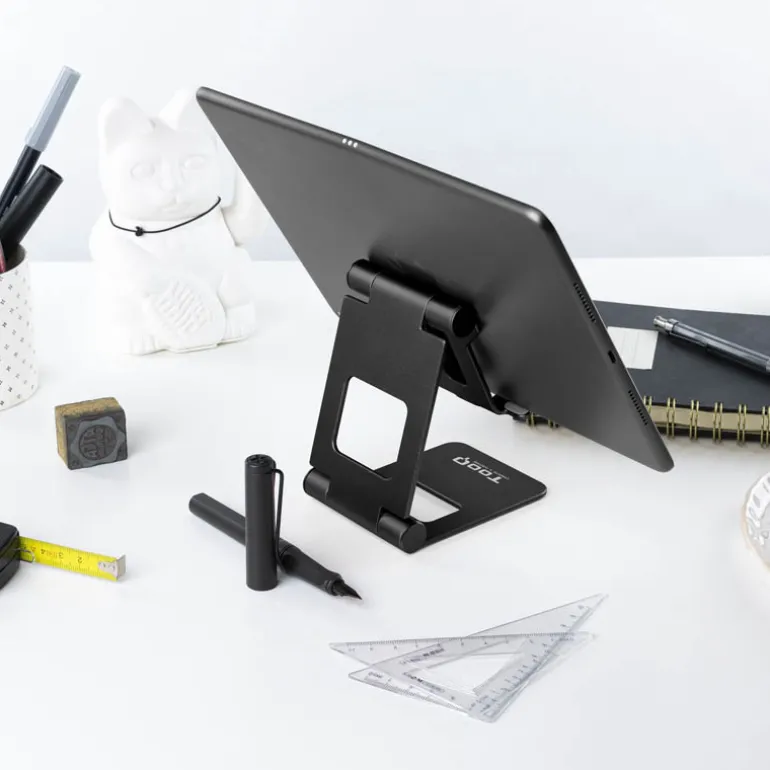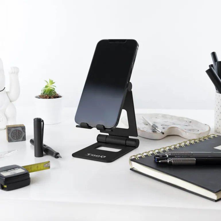 Soporte de sobremesa ajustable para teléfono / tablet hasta 10鈥ón de aluminio, siempre con la calidad de los productos TooQ. Dispone de almohadillas de silicona antideslizantes, para proteger de arañazos y deslizamientos.