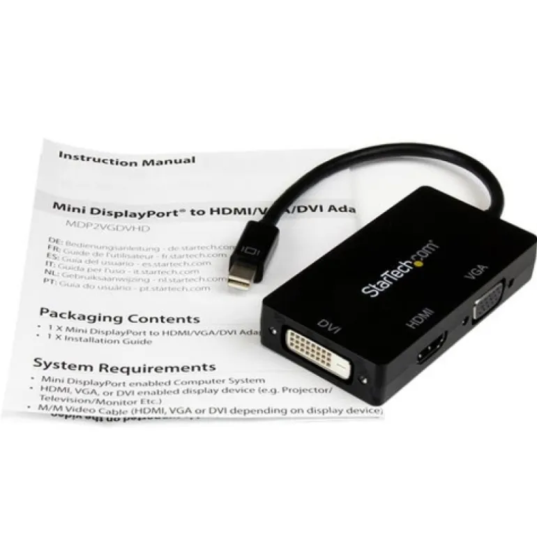 ¿Por qué llevar varios adaptadores cuando solo necesita uno? En lugar de tener que llevar tres adaptadores consigo, el adaptador de viaje para mDP incluye salidas VGA DVI y HDMI, a fin de poder conectar la salida mDP de su ordenador portátil a cualquier pantalla de una sala de juntas o un aula moderna: solución plug-and-play ideal cuando es necesario traer el equipo propio al trabajar en una oficina («BYOD», del inglés «Bring Your Own Device»).