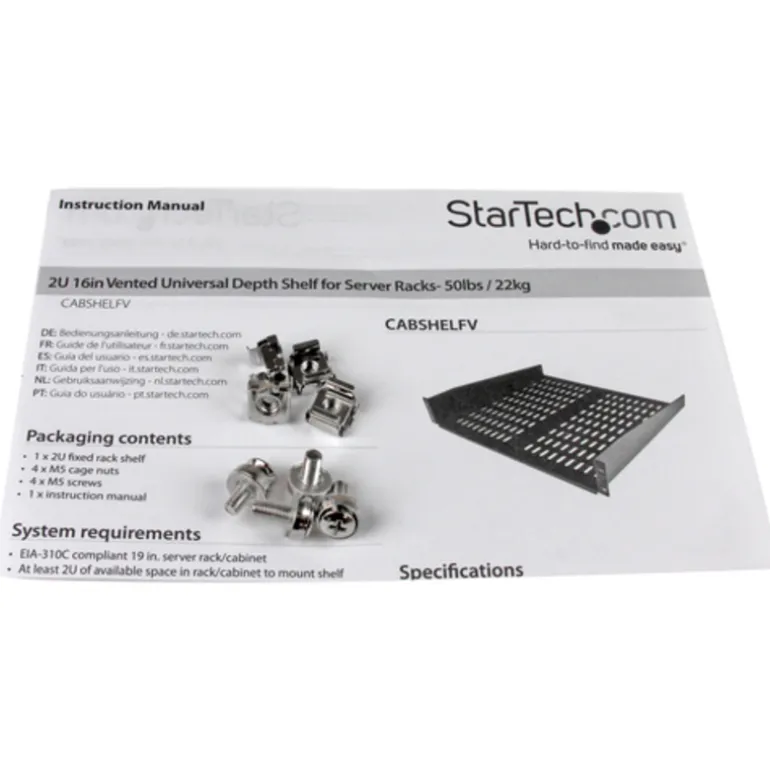 El Estante Ventilado Universal de Montaje en Rack 2U con 16 pulgadas de Profundidad, CABSHELFV permite agregar un estante compacto de 2U a prácticamente cualquier rack o gabinete de servidores estándar de 19 pulgadas con opciones de montaje frontal. Este producto cumple con los requisitos del acuerdo TAA («Trade Agreements Act», Ley de Acuerdos Comerciales) federal de EE.UU., lo cual permite compras gubernamentales del Programa GSA.