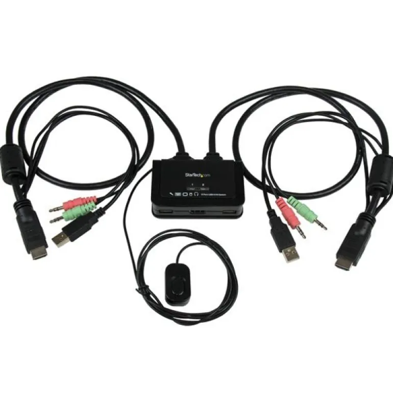 | El conmutador KVM de cables HDMI®, con 2 puertos y control para la conmutación remota y de audio, modelo SV211HDUA, permite controlar dos ordenadores equipados con HDMI y USB mediante un solo conjunto de periféricos: un monitor, un teclado, un ratón y un solo audio. A fin de ayudar a organizar su escritorio sin sacrificar espacio de trabajo, este compacto conmutador KVM HDMI USB incluye cables integrados que se pueden conectar directamente al sistema, lo cual ocupa un espacio mínimo. El conmutador incluye un botón para control remoto en un cable integrado de 1,5 metros, el cual se puede colocar en un lugar de fácil acceso, además de teclas de acceso rápido para el teclado y software compatible con PC o Mac para conmutar entre sistemas. Para evitar el uso de un adaptador externo de alimentación, este conmutador KVM HDMI se alimenta mediante una conexión USB. Este conmutador KVM con capacidad para vídeo HDMI ofrece también soporte para resoluciones de alta definición de 1080 p (hasta 1920×1200), lo cual permite el uso de pantallas HDMI grandes para aplicaciones que requieren salida gráfica de alta resolución. Avalado por la garantía de dos años de StarTech.com y con soporte técnico gratuito de por vida. |