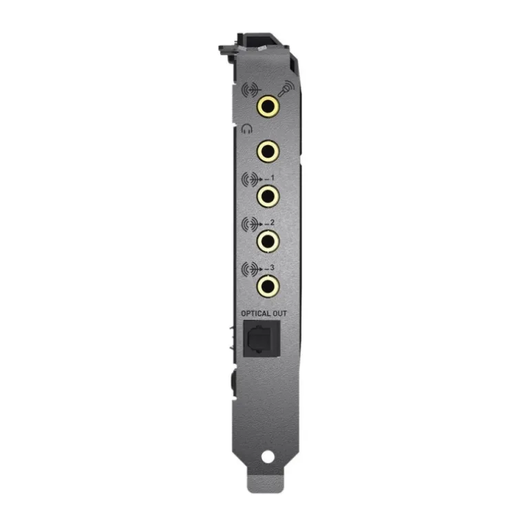 1 salida óptica TOSLINK, 1 x 3.5 mm salida trasera, 1 x 3.5 mm salida central/Sub, 1 entrada de micro / entrada de línea de 3,5 mm (seleccionable a través de software, valor predeterminado: entrada de micro), 1 salida de cascos / cascos con micrófono de 3,5 mm (valor predeterminado: cascos), 1 salida delantera de 3,5 mm