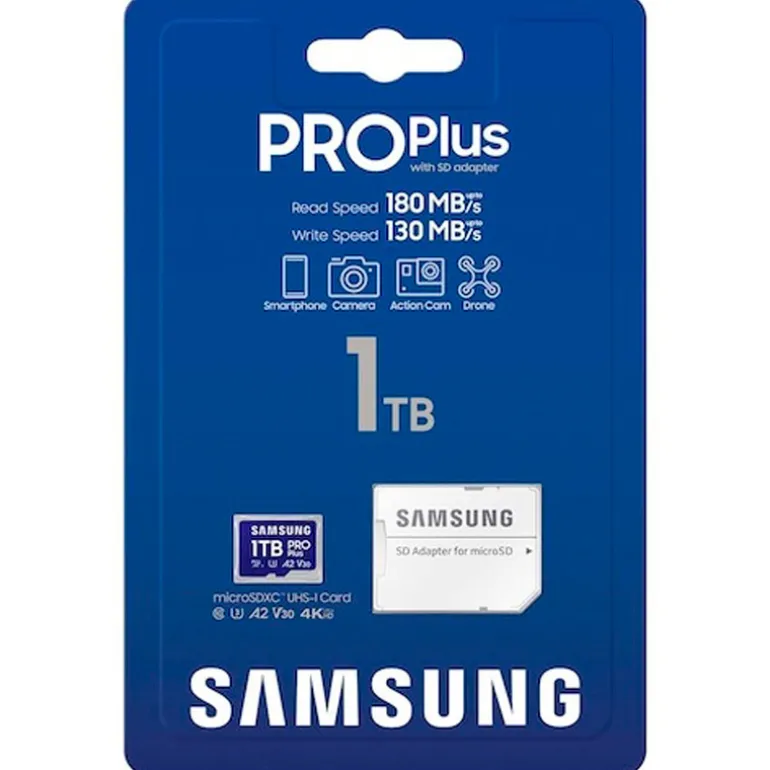 Samsung microSDXC Pro Plus 1TB: almacenamiento masivo y fiable para ampliar tu móvil, tablet, cámara o dron. Rendimiento de la gama Pro Plus para transferencias ágiles y captura fluida de fotos y vídeo de alta resolución. Formato microSDXC de 1 TB para trabajar, grabar y transportar grandes bibliotecas sin complicaciones.