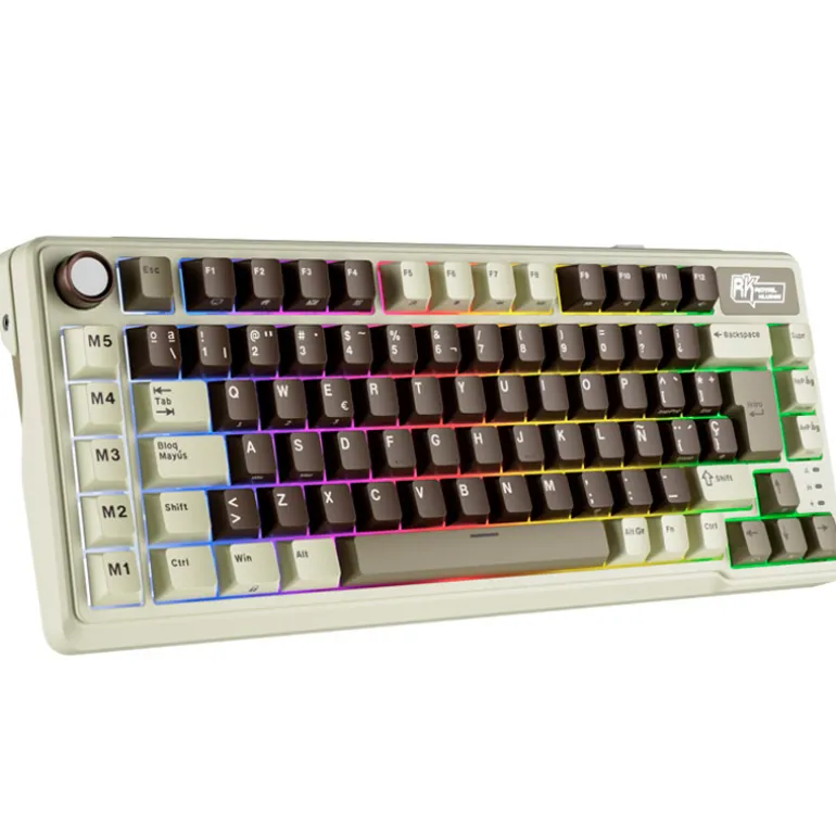 El Royal Kludge RKL75 ISO-ES RGB Hot-Swappable Switch Beige Wireless Mokko Grey es un teclado mecánico compacto de 75% que combina rendimiento, estilo y personalización para Mac y Windows. Equipado con interruptores Beige intercambiables en caliente, este teclado ofrece una experiencia de tecleo suave y cómoda. Su retroiluminación RGB arcoíris y conectividad versátil a través de Bluetooth, USB-C y Radiofrecuencia lo convierten en una opción ideal para juegos y productividad.