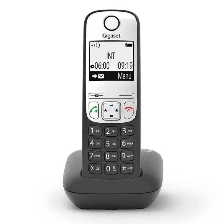 Lo primero que se nota sobre el Gigaset A690 es su gran pantalla gráfica iluminada en blanco y negro. La pantalla tiene varias ventajas: la gran pantalla numérica en el modo de marcación y el fuerte contraste entre las letras blancas y el fondo negro se han diseñado para garantizar que el teléfono sea aún más fácil de usar. El teclado ergonómico con teclas iluminadas y el manejo intuitivo, también contribuyen a que hablar por teléfono sea lo más cómodo posible.