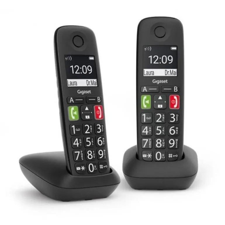 Teléfono fijo inalámbrico Gigaset E290 DECT Duo en color negro, diseñado con teclas grandes, pantalla fácil de leer y un diseño ergonómico. Ideal para usuarios con necesidades visuales, auditivas y táctiles específicas.