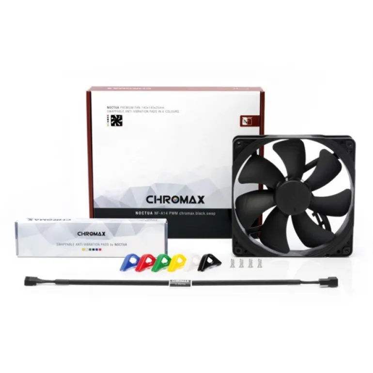 La edición chromax.black.swap combina la característica de refrigeración silenciosa del NF-A14 con un atractivo diseño totalmente negro y un conjunto de almohadillas anti-vibración de color rojo, blanco, azul, verde, amarillo y negro que permiten la personalización del ventilador para que coordine con cada estructura individual.
