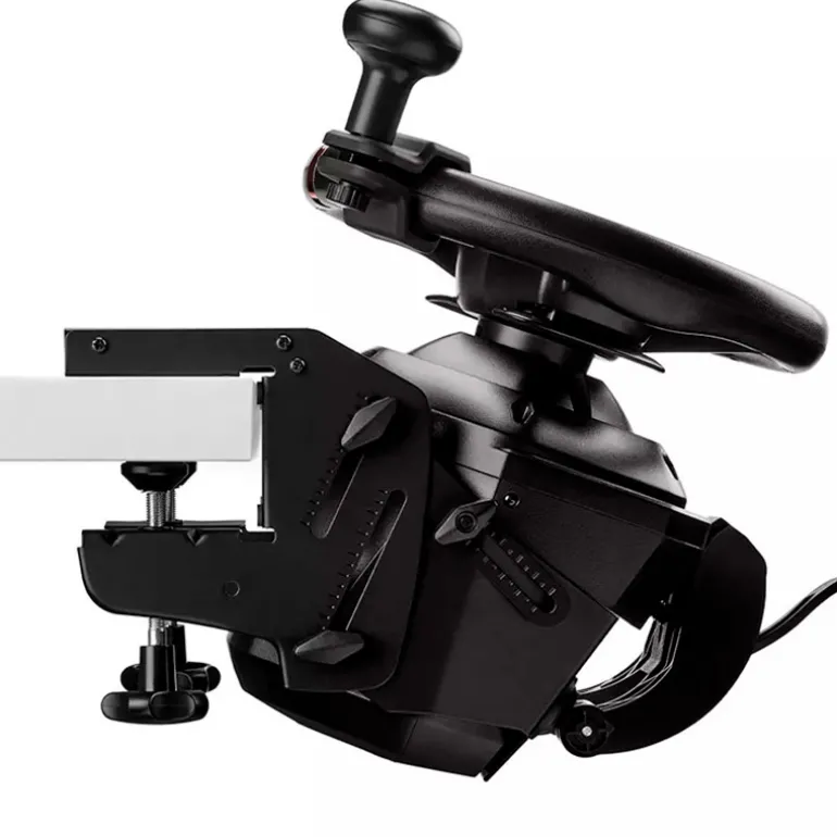 El SimTask Steering Kit cuenta con un sistema de sujeción para escritorios de entre 15 mm y 50 mm de grosor, lo que permite ajustar fácilmente la inclinación y la altura del T128 sin herramientas ni desmontaje. Cambia rápidamente de una posición a otra: desde carreras de coches hasta simulación agrícola o transporte por carretera.